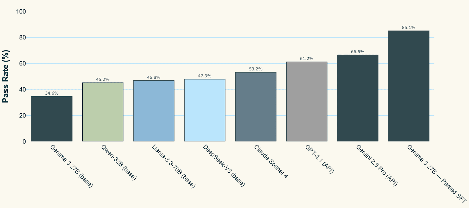 Before Fine-Tuning: For the clinical scribe task, Parsed set the baseline as the performance of Sonnet 4 (a model commonly used by clinical scribe companies) and benchmarked Gemma 3 27B against it. Unsurprisingly, Gemma (a much smaller model) performed 35% worse on the evaluation harness. Strong open baselines sit a clear step below Sonnet 4: Qwen-32B by roughly 15% lower, Llama-3.3-70B around 12% lower, and DeepSeek-V3 about 10% lower. Among proprietary generalists, GPT-4.1 lands about 15% better than Sonnet 4, with Gemini-2.5-Pro closer to 25%.